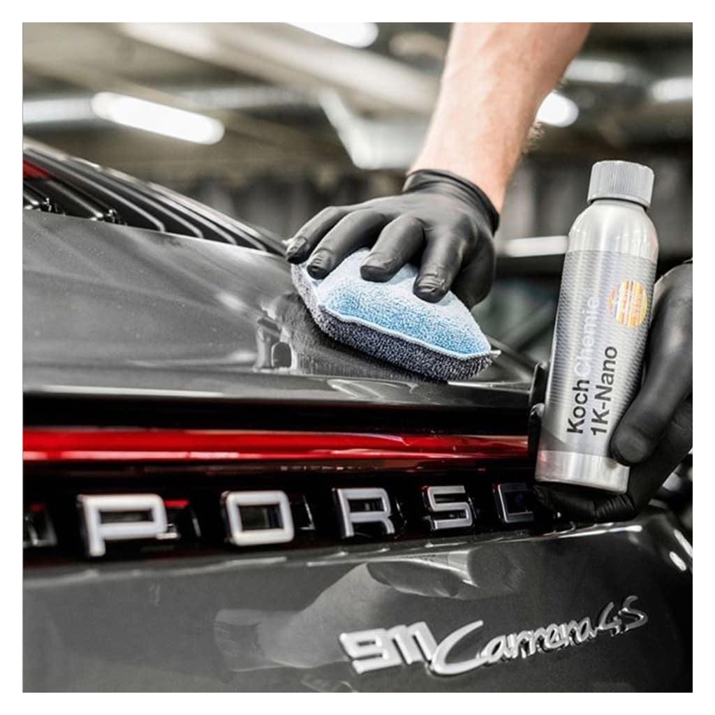 C. Aplikácia: 1K Nano si najprv prelejeme do aplikátora (malá plastová fľaštička); ktorý je priložený v balení (1x plný aplikátor = auto o veľkosti Škody Superb combi). Potom nanesieme prípravok do čiernej hubky a malými krúživými pohybmi nanášame na karosériu. 1K Nano vždy aplikujeme postupne po jednotlivých častiach karosérie. Prípravok necháme na karosérii zaschnúť približne 7 - 10 minút; potom dôkladne rozleštíme modrou mikrofázovou utierkou. Po troch hodinách preleštíme vozidlo novou (čistou) modrou mikrofázovou utierkou a necháme ďalšie tri hodiny vytvrdnúť. Potom je vozidlo zakonzervovanie.